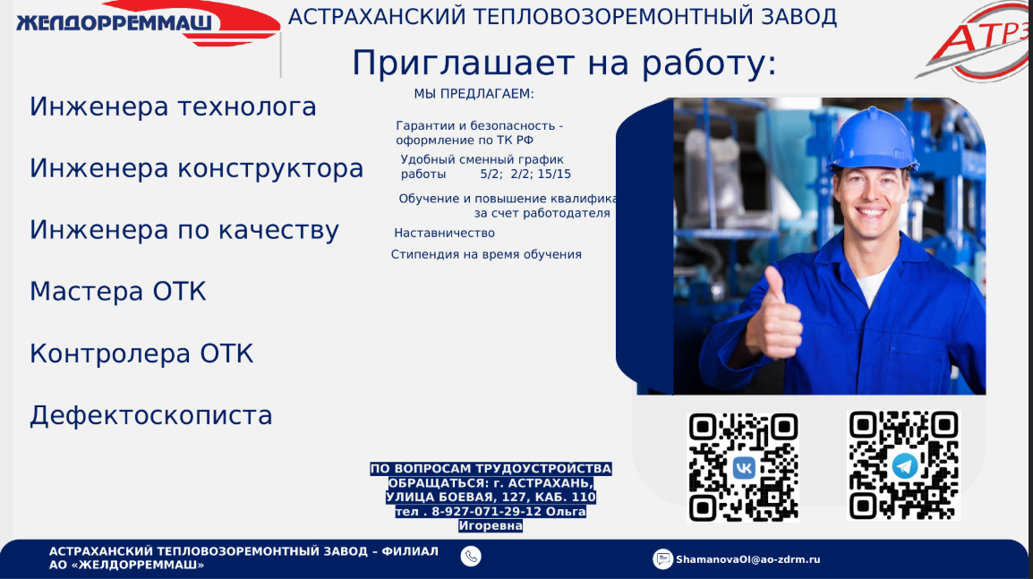 АСТРАХАНСКИЙ ТЕПЛОВОЗОРЕМОНТНЫЙ ЗАВОД приглашает на работу